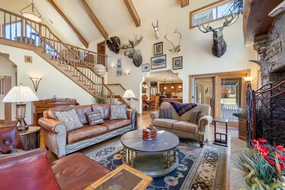 Offering a very quiet and secluded family retreat located in the Black Hills, south of Beulah, Wyoming along Sand Creek. This spectacular and private setting is surrounded with looming canyon walls and offers a clear water blue ribbon trout fishing stream out the back door of the custom stone home and separate recreation/shop/garage. The entire Sand Creek Subdivision contains approximately 425 acres which includes the shared use areas. The property and buildings itself include approximately five acres which are cared for exclusively by the owner.