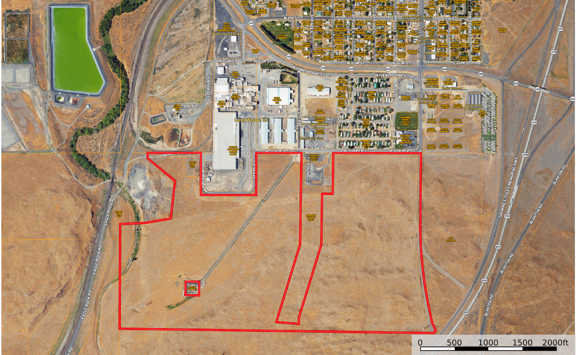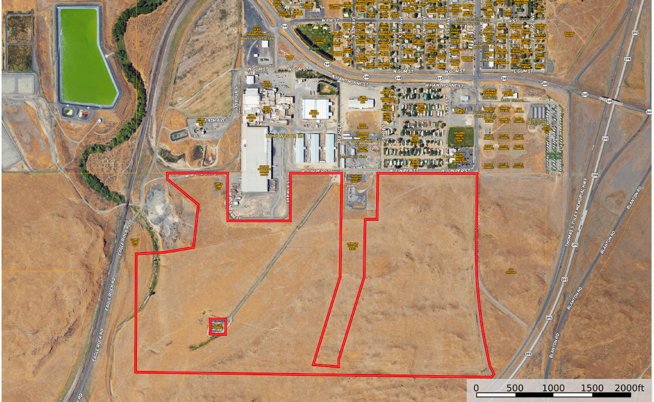219.43 acres bordering the City of Connell. The property consists of a 2 acre parcel in the city limits of Connell and the remaining 217.43 acres are located within the city's Urban Growth Boundary and is currently zoned 1-2 General Industrial Zone which also allows for all of the C-3 General Business Zone uses. The property is fairly level allowing for easier development.