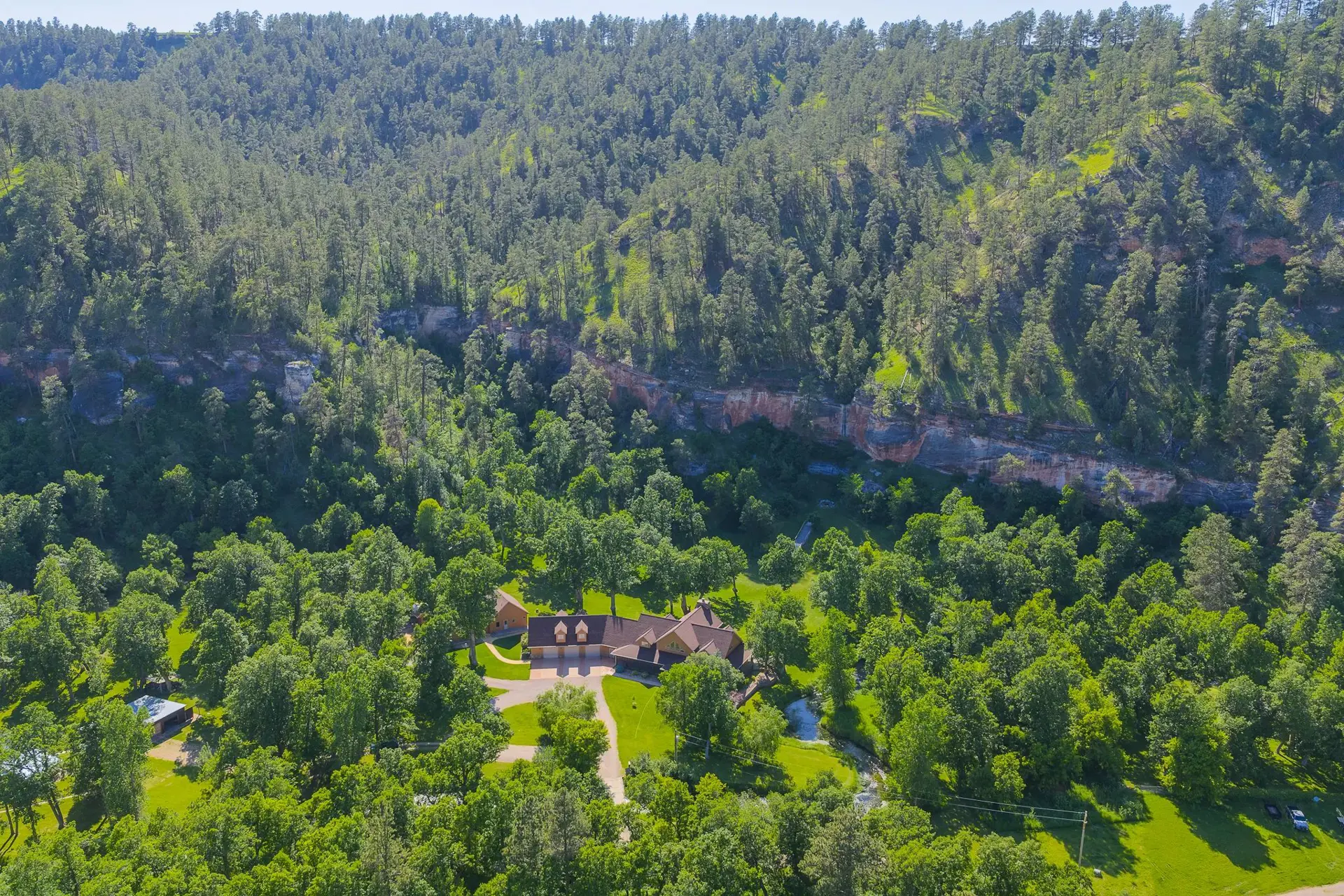 Offering a very quiet and secluded family retreat located in the Black Hills, south of Beulah, Wyoming along Sand Creek. This spectacular and private setting is surrounded with looming canyon walls and offers a clear water blue ribbon trout fishing stream out the back door of the custom stone home and separate recreation/shop/garage. The entire Sand Creek Subdivision contains approximately 425 acres which includes the shared use areas. The property and buildings itself include approximately five acres which are cared for exclusively by the owner.